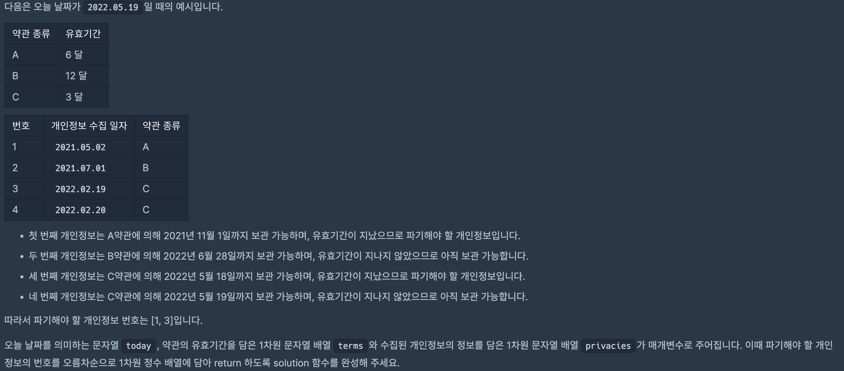func solution(_ today:String, _ terms:[String], _ privacies:[String]) -> [Int] {