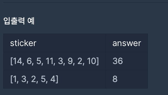 1. ์ฒซ๋ฒ์งธ ์คํฐ์ปค๋ฅผ ๋ ๊ฒฝ์ฐ -> ๋๋ฒ์งธ ์คํฐ์ปค๋ ์ฌ์ฉํ์ง ๋ชปํจ, dp[0] = sticker[0], dp[1] = sticker[0]