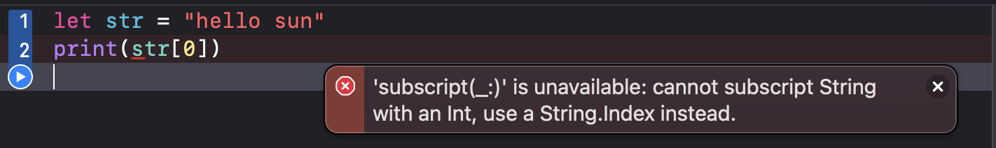 Int๋ฅผ ์ด์ฉํด์ String์ subscript๋ฅผ ์ฌ์ฉํ ์ ์๊ณ ๋์ String.Index๋ฅผ ์ฌ์ฉํ๋ผ๊ณ ํ๋ค.